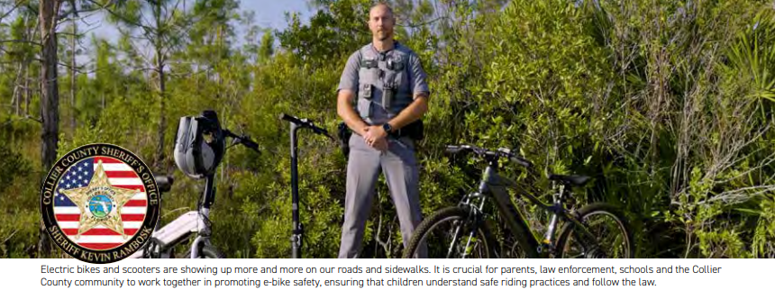 To learn more about e-bike safety-including about e-motors and electric scooters-visit the Collier County Sheriff ’s Office