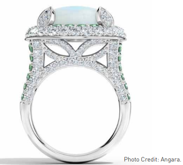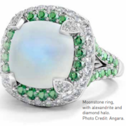 When it’s cut into cabochon, we can almost see the moonlight follow the eye of the viewer—what a show! In earlier times the lovely moonstone was placed into lower priced jewelry. Imaginative designers are revisiting this captivating stone-with-a-show. Pairing this delicate gemstone with bolder colored gemstone accents shows it to its optimum.