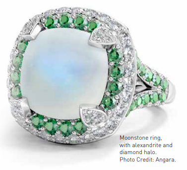 When it’s cut into cabochon, we can almost see the moonlight follow the eye of the viewer—what a show! In earlier times the lovely moonstone was placed into lower priced jewelry. Imaginative designers are revisiting this captivating stone-with-a-show. Pairing this delicate gemstone with bolder colored gemstone accents shows it to its optimum.