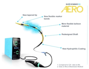 The procedure works by inserting a specialized balloon catheter into the narrowed artery. When activated, the catheter delivers short bursts of sonic energy similar to the technology used to break up kidney stones. These sound waves create tiny fractures in the calcium deposits, softening the blockage so the artery can be expanded and stented more easily. Unlike older methods that use high-pressure tools to grind or cut through calcium, Shockwave IVL minimizes trauma to the vessel, reduces complications, and shortens procedure time – the new Shockwave C2 AERO™ catheter represents the latest evolution of this technology.