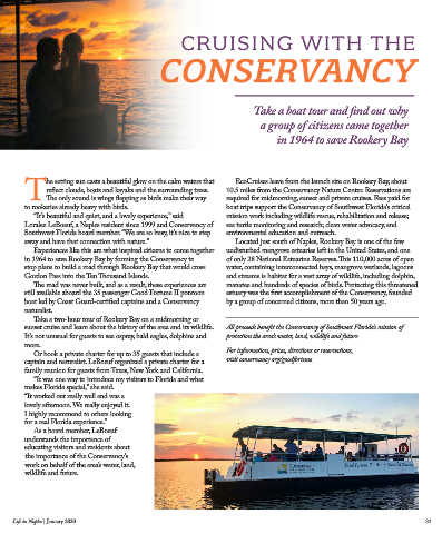 sunset cruise and learn about the history of the area and its wildlife. All proceeds benefit the Conservancy of Southwest Florida’s mission of