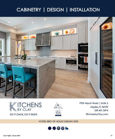 CABINETRY | DESIGN | INSTALLATION 7935 Airport Road | Suite 5 Naples, FL 34109 239.431.5474 DO IT ONCE, DO IT RIGHT. KitchensbyClay.com VOTED BEST OF HOUZZ DESIGN 2020 Life in Naples | January 2022 57