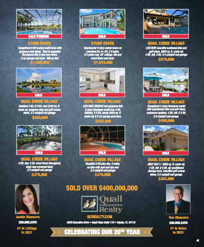 master suite with outdoor patio, pool lanai with pool, 3 car garage and more. 3 car garage and circular driveway den/office, family room gorgeous lanai 239.595.2479 4500 Executive Drive • Quail Plaza Suite 110 • Naples, FL 34119 239.595.2478
