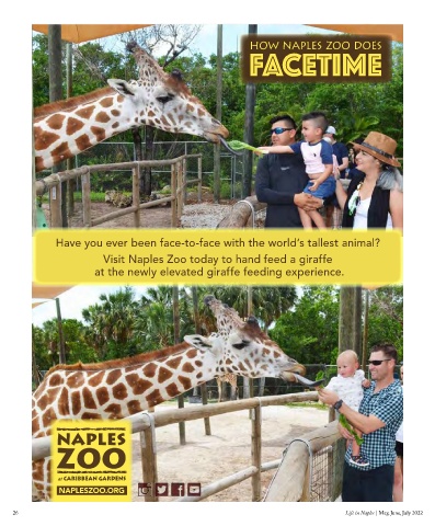NEW! HOW NAPLES ZOO DOES FACETIME Have you ever been face-to-face with the world’s tallest animal? Visit Naples Zoo today to hand feed a giraffe at the newly elevated giraffe feeding experience. NAPLESZOO.ORG 26 Life in Naples | May, June, July 2022