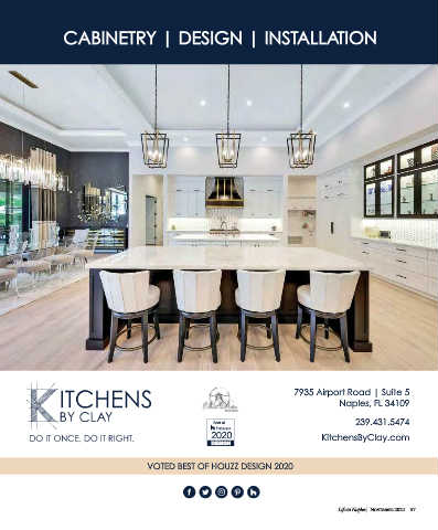 CABINETRY | DESIGN | INSTALLATION 7935 Airport Road | Suite 5 Naples, FL 34109 239.431.5474 Best of 2020 KitchensByClay.com DESIGN VOTED BEST OF HOUZZ DESIGN 2020 Life in Naples November 2022 57