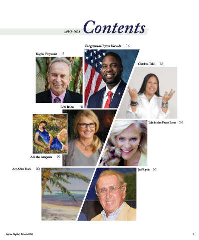 Contents MARCH 2023 Congressman Byron Donalds 14 Naples Potpourri 8 Chickee Talk 16 Lois Bolin 18 Life in the Facet Lane 24 Ask the Artsperts 22 Art After Dark 30 Jeff Lytle 60 Life in Naples | March 2023 7