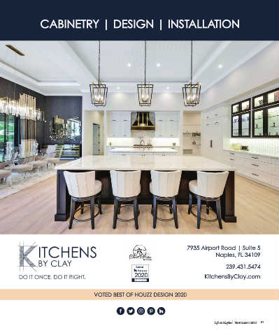 CABINETRY | DESIGN | INSTALLATION 7935 Airport Road | Suite 5 Naples, FL 34109 239.431.5474 Best of 2020 KitchensByClay.com DESIGN VOTED BEST OF HOUZZ DESIGN 2020 Life in Naples N 2022 57