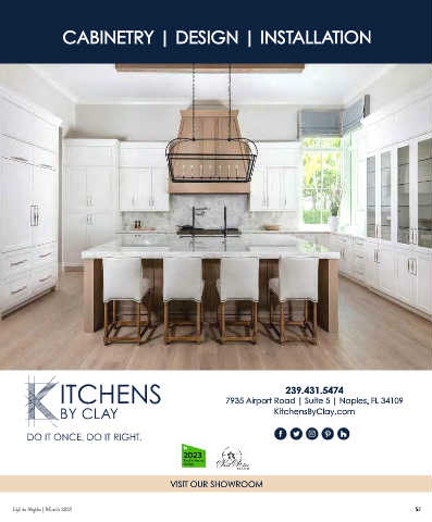 CABINETRY | DESIGN | INSTALLATION 239.431.5474 7935 Airport Road | Suite 5 | Naples, FL 34109 KitchensByClay.com VISIT OUR SHOWROOM Life in Naples | March 2025 55