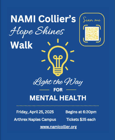 NAMI Collier’s Hope Shines Walk Light the Way FOR MENTAL HEALTH Friday, April 25, 2025 Begins at 6:30pm Arthrex Naples Campus Tickets $35 each www.namicollier.org Life in Naples | March 2025 61