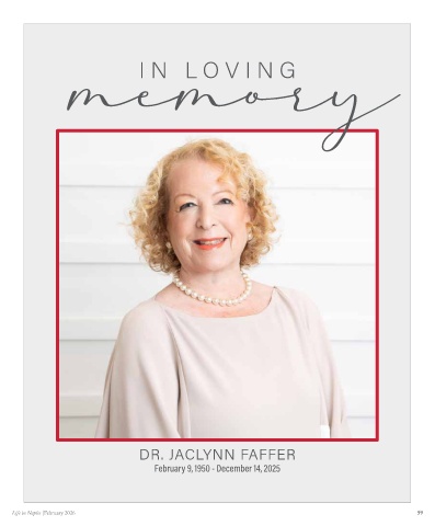memory I N L OV I NG DR. JACLYNN FAFFER February 9, 1950 - December 14, 2025 Life in Naples |February 2026 59