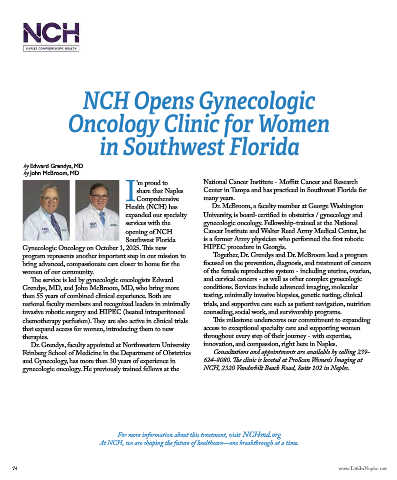 gynecologic oncology. He previously trained fellows at the NCH, 2320 Vanderbilt Beach Road, Suite 102 in Naples.